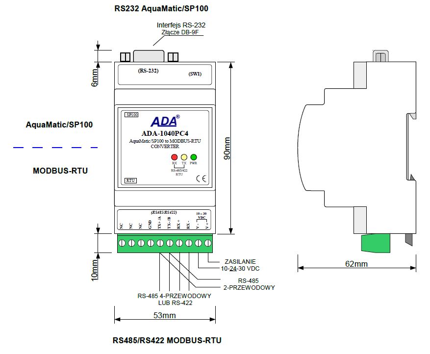ADA-1040PC4 wyposażony jest w żeńskie gniazdo DB-9 do podłączenia interfejsu RS232 sterownika CD AquaMatic oraz w listwę zacisków śrubowych dla podłączenia zasilania i skrętkowych połączeń magistrali RS485 / RS422. Złącze DB-9 żeńskie interfejsu RS232 w konwerterze wykonane jest jako DCE.