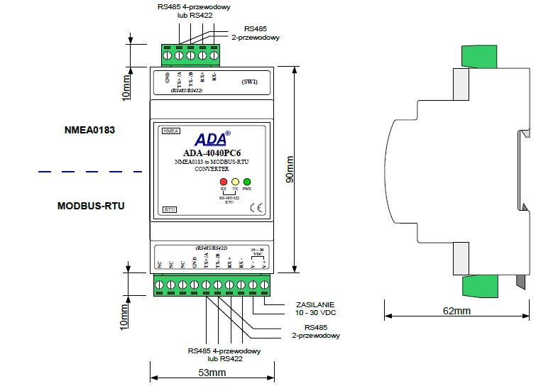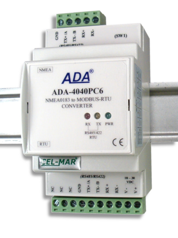 Konwerter protokołów NMEA0183 na MODBUS-RTU ADA-4040PC6 jest urządzeniem rozwiązującym problem podłączenia urządzeń komunikujących się protokołem NMEA0183 do wielopunktowej (multipoint) magistrali RS-485 do, której podłączone są urządzenia komunikujące się protokołem MODBUS-RTU. Jednocześnie konwerter może dokonać zamiany prędkości i format przesyłanych danych między portem protokołu NMEA0183 a portem protokołu MODBUS-RTU.