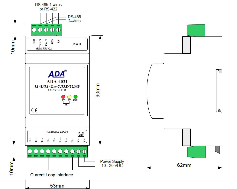 The ADA-4021 converts RS485/RS422 standard to Current Loop without interfering with format of transmitted data with maximum baud rate of 38,4kbps via 2-pair of twisted pair. The converter has screw terminal block for connection of RS485/422, Current Loop networks and power supply. This device use RX+, RX-, TX+, TX- signals for operating. Over-voltage protection was made on base safety diodes and fuses on each RS485/RS422 and Current Loop lines. It is possible to connect up to 32 devices operate in half duplex mode (inquiry / response) on 2 or 4 wires, multipoint bus or full duplex mode on 4 wires bus, built on the base of ADA-4021 converters. To Current Loop interface can be connected one device in point-to-point topology, operates in half duplex or full duplex mode. Current Loop connected device can has passive or active transmitter and receiver. This converter has internal, low energy surge protection for each Current Loop lines however it is recommended to use the external lightning arresters (typical protection of telephone line) for the lightning protection of lines. |
